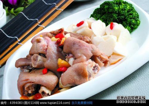 2,将猪舍放入锅中,热水未通过猪圈,加入白汤和八角形汤匙,加??热火,以打开浮泡,煮至少火,80%猪蹄如果变坏,加入适量的盐加火,继续煮,直到猪蹄完全变软并腐烂。